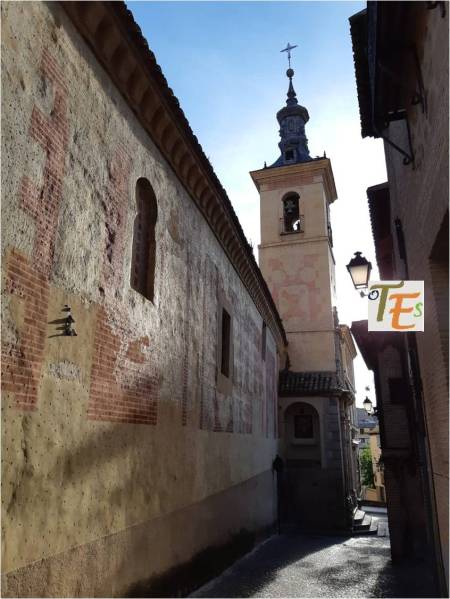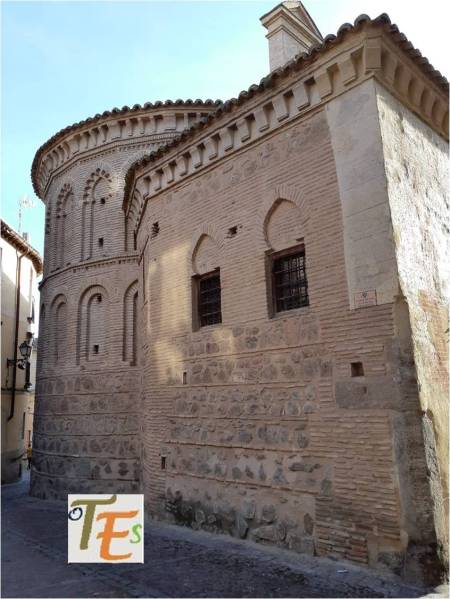 Exteriormente vemos otro de los ábsides con el estilo que predomina en la ciudad de Toledo, el arte mudéjar. Al lado podemos observar su espadaña y detrás el frontón escalonado, donde comienza la nave del templo. Nos referimos a la parroquia latina dedicada a San Justo y Pastor.