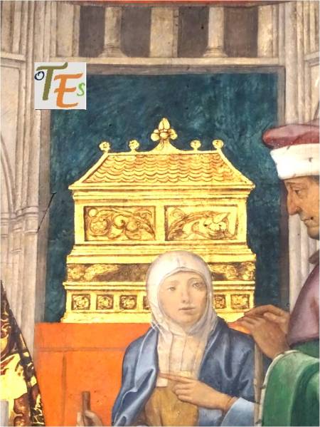 En esta escena hallamos uno de los ejemplos más representativos, debido a la tradición de que por la iglesia de Toledo, pasó el famoso por antiguo “Arca de la Alianza” o “Arca de las Reliquias”. Detalle pintado por Juan de Borgoña, en la Sala Cisneriana de su catedral.