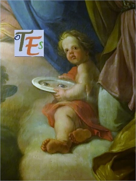 Detalle de la pintura de Navarro sobre Santa Lucía, en la Capilla de los Doctores, en la antecapilla de la Capilla del Sagrario. En el vemos a un ángel, que sustenta un plato, donde se encuentran los ojos de la santa, tras su martirio.