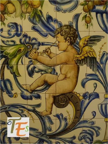 Angelote entre ramas y cornucopias, el cual está dedicado al arte de la cerámica, al encontrarse pintando un jarrón con esmaltes. Debemos esta escena, a uno de los ceramistas más fecundos y artísticos en dicha técnica, como fue el maestro Vicente Quismondo.