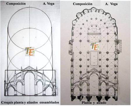 Sobre los tres círculos rectores en que se basa el perímetro en la planta de la Catedral de Toledo, describiendo un semicírculo en su base y usando el rectángulo áureo, se obtienen tanto el alto, como el ancho basilical del templo. Al otro lado, siguiendo la misma composición, vemos sobre el plano original, las alturas reales de sus bóvedas en la planta.