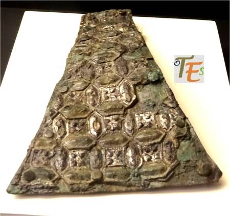 Esta bella placa de metal repujado de época tardo-romana, que pudo pertenecer a un pectoral, apareció en la villa romana de Carranque, en el cercano pueblo de Illescas.