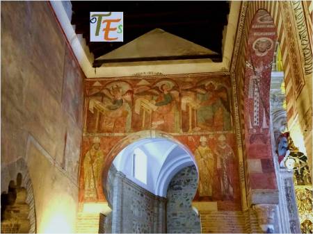 En la nave de la epístola de la antigua iglesia de San Román, entre arcos de herradura, califales y lobulados, vemos sus preciosas pinturas de tipo románico toledano, con papas y santos cristianos y por encima tres escenas correspondientes a los tetramorfos.