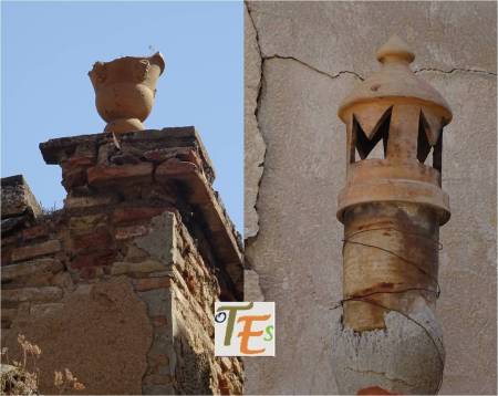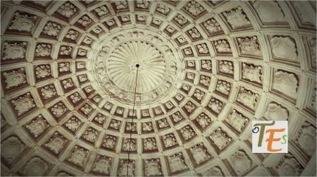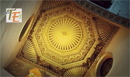 Trampantojos muy desgastados, donde observamos las junturas de cada ladrillo con su pintura y lo más llamativo, es ver espejos en marcados, los cuales reflejarían el edificio de frente, hoy ya sin su brillo original.