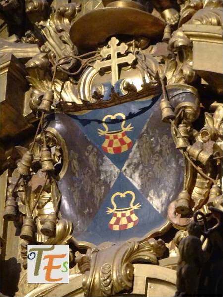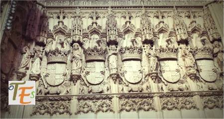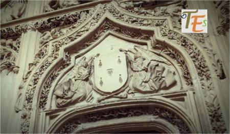 Formando parre del pilar toral del norte, denominado de las Sibilas, observamos en detalle el escudo del arzobispo de Toledo Dº Pedro de Luna, sobrino del entonces Papa Luna. Benedicto XIII, que pasó por esta sede de puntillas. A su lado el escudo de los Trastámara, en tiempos de los potentes Reyes Católicos.