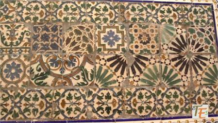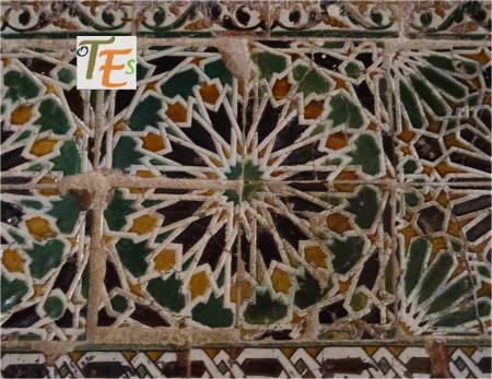 Precioso ataurique mudéjar, con las geometrías octogonales musulmanas y entre ellas letras cúficas, donde se alba a Alláh. Forma este parte de un palacio cristiano, de ahí la tolerancia toledana.