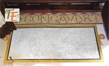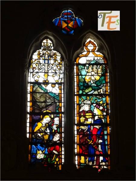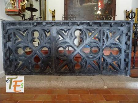 Uno de los modelos de los muchos tipos de ventanales, que se encuentran dando luz al interior de la catedral de Toledo, por medio de sus vitrales. Dicho patrón arquitectónico entre otros, se encuentra gravado sobre una losa de jaspe, que ahora forma parte de un enterramiento.