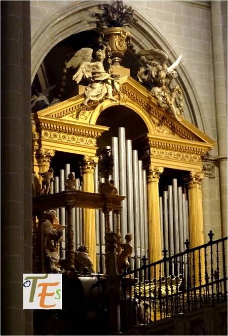 Desde su tribuna, el ábside de la capilla gótica de San Pedro en la catedral, con el cuadro de la curación del paralítico de Bayeu. Fue fundada por D. Sancho de Rojas.
