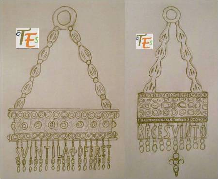 Instantánea donde observamos dos copias de las coronas oferentes más importantes de los reyes visigodos, como son la de Suintila que entre el 621 al 631 consiguió reinar sobre toda la península y la de Recesvinto que legó el Liber Iudiciorum o Código de Recesvinto entre el 656 al 672.