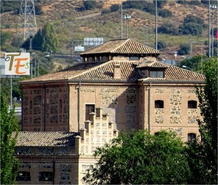 Detalle ya desaparecido, de un edificio construido en los alrededores de Toledo en estilo neomudéjar, con arco de herradura enjarjado, contenedor de otro lobulado circular. Por encima la sebka con sus típicos rombos.