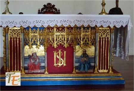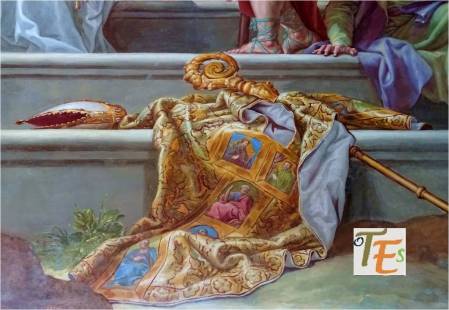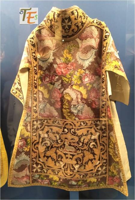 Bellísimo ropaje religioso, debido al taller de Molero, con la Cruz de Malta en el cuello y laterales del rectángulo inferior, donde vemos al cordero místico. Sobre los omoplatos, dos manos abrazan al diácono. Dicho terno es muy paracido al que viste San Esteban, en el cuadro del Entierro del Señor de Orgaz, del Greco.