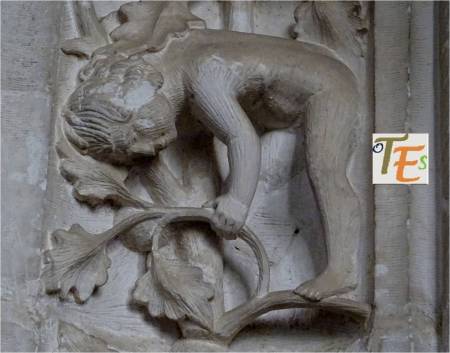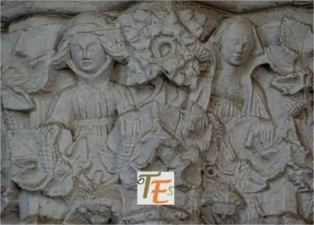 Entre los capiteles de las columnas del claustro catedralicio toledano, observamos a varias figuras levantando espadas y velas Se refieren a la fiesta teatral de la Sibila, que se representa este acto teatral en dicho templo en el mes de diciembre.