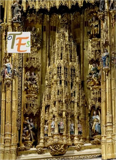 En el centro del maravilloso por espléndido retablo gótico, perteneciente al altar mayor de la catedral toledana, en su parte media observamos tallada en madera dorada, una virtuosa torre eucarística, diseñada por el maestro Petit Juan y en la que trabajaron otros grandes artistas como Felipe Bigarny, Copín de Holanda, Sebastián de Almonacid o maestro Rodrigo entre otros. Esta obra eucarística inspiró años más tarde al alemán Enrique de Arfe, para ejecutar la famosa custodia de Cisneros.