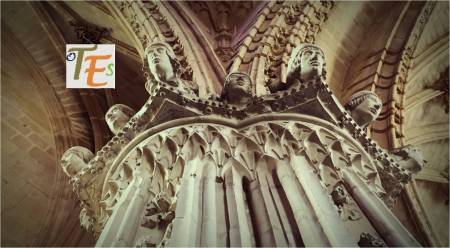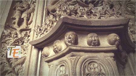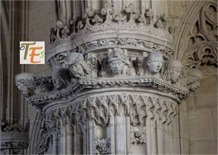 Sobre uno de los pilares torales de la gran iglesia gótica de San Juan de los Reyes, se observan las cabezas de los oficiales y aprendices que trabajaron en tan magnífica obra. Sobre ellos dos coronas, las de los Reyes Católicos, que mandaron construirla para su enterramiento.