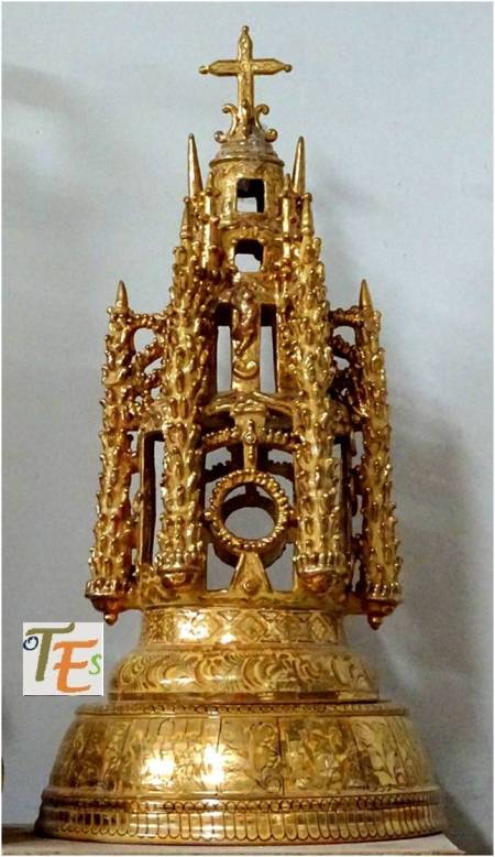 Custodia ejecutada en barro por el artista Domingo Sánchez Vaquero, y luego revestida cerámicamente en el color del brillante oro, por él mismo, para dar a esta su total concepción eucarística, pero sobre todo una gran singularidad.