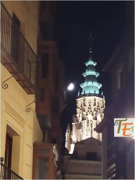 La aguja catedralicia o alcuzón, levantándose nocturnalmente por entre las calles toledanas, asombrándonos su figura por el solo placer de admirar una joya tan gótica, a la que parece dar luz la Luna por encontrarse a su lado, en estos momentos de la instantánea.