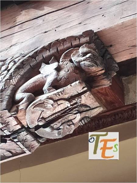 Heraldo de armas de tiempo de los Reyes católicos, que está tallado en el antecoro del monasterio de San Juan de los Reyes. Por su postura, sustentando con su hombro el friso que mantiene la balaustrada, levantándose el faldón sobre su rodilla izquierda y sujetando su porta compás, posiblemente se refiera al maestro de dicha obra, Juan Guas.