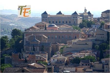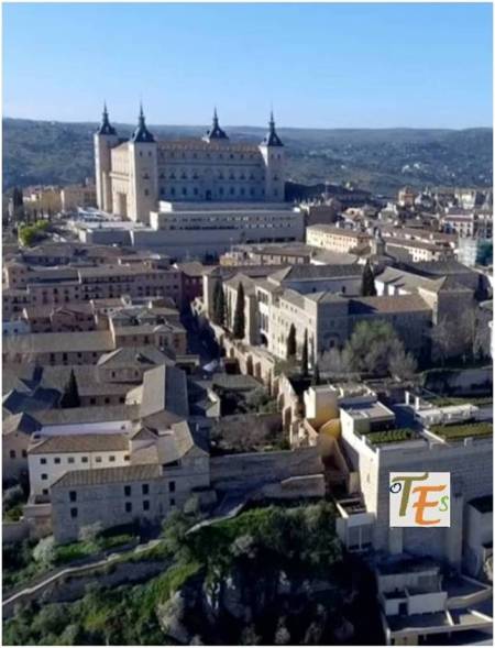 Vista aérea desde el norte de la ciudad, donde podemos ver su zona conventual, parte del Hospital de la Santa Cruz y sobre su colina más alta, su imponente Palacio Imperial, conocido como “El Alcázar”, desde tiempos musulmanes.