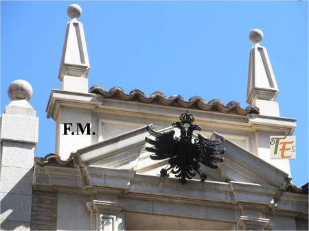 Frontón con el escudo del águila imperial y por encima, los modernos pináculos de las alturas de los que fue en Toledo la sede del Banco de España.