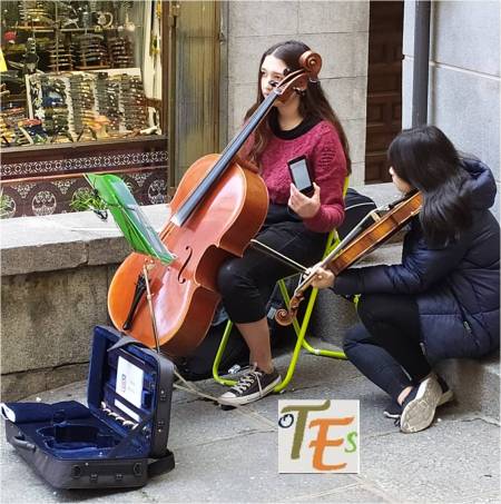 Dos aspirantes a músicos, tocando sus melodías en las Cuatro Calles, con un violín y un violonchelo.