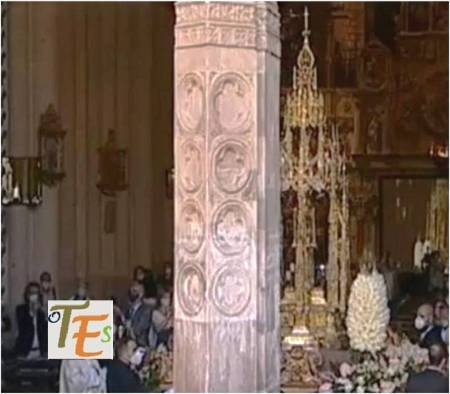 Este es el viril o porta hostias, parte principal de la custodia de la catedral de Toledo. Le vemos bendiciendo el día del Corpus del año 2020, desde la Puerta de Reyes de la catedral de Toledo.