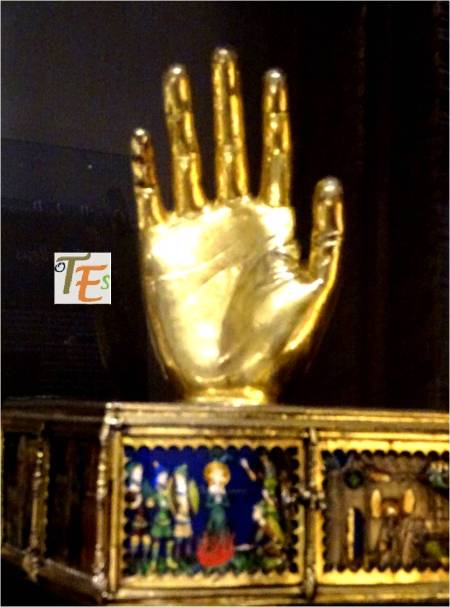 Uno de los ricos relicarios que contiene la catedral toledana. Mano donde se halla uno de huesos de Santa Cecilia, patrona de los músicos.