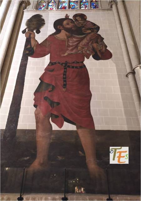 Pintura al fresco del gigante San Cristóbal, en uno de los muros de una de las capillas de la catedral, con el niño Jesús a cuestas y por ello hundiéndose en el río.
