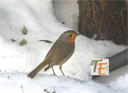 Un petirrojo entre la gran nevada “Filomena”, buscando el sustento para su nido y sus crías.
