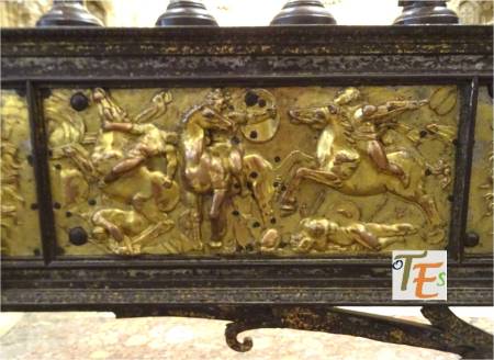 Rico friso repujado en sobrerelieve en bronce y oro bruñido, representando la batalla de Troya, que forma parte en la zona baja de la famosa reja principal de la catedral, obra de Francisco de Villalpando.