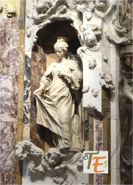 La bellísima y barroca estatua de cuerpo entero, de nuestra santa principal Casilda, coronada por su santidad, ofreciendo flores. Tallada en un mármol especial traído desde Génova, para ser colocada en una de las obras más universales que existen en el orbe. Me refiero al controvertido «Transparente», el cual al ser contemplado, da paso a un imaginario extraordinario, que solo se puede dar en Toledo.
