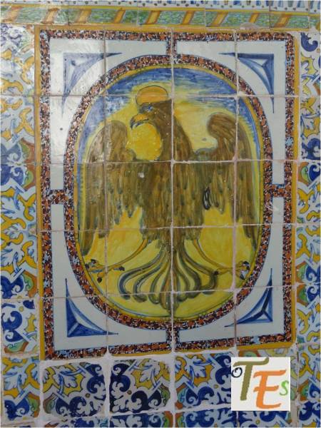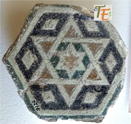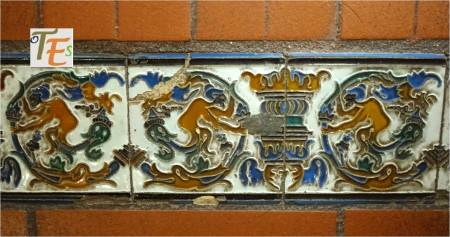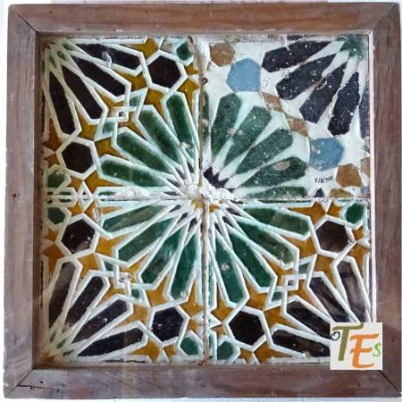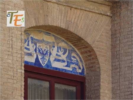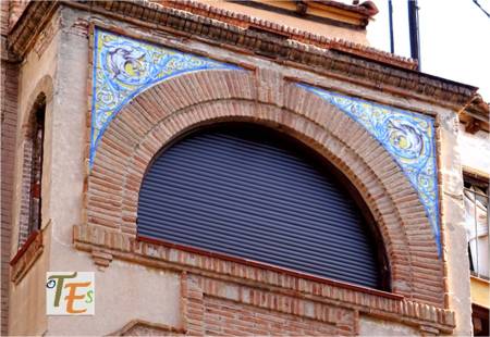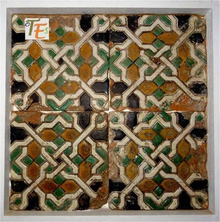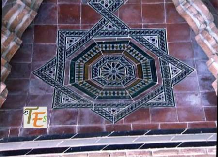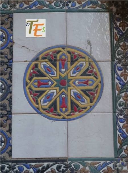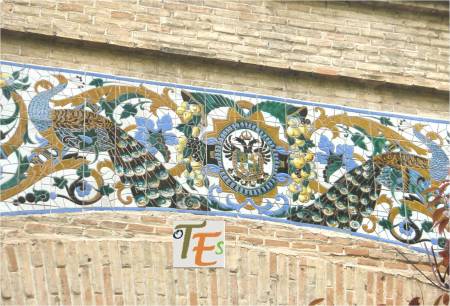 Rica estampa de un trabajo geométrico diseñado en cerámica por el arquitecto Dº Arturo Mélida, donde se representan dos cuadrados entrelazados con sus cenefas, que nos conducen a un octógono, el cual contiene en su interior una estrella de tipo mudéjar, con su ojo central. Se encuentra en el cubo de entrada a la Escuela de Artes y Oficios que este diseño, siendo por ello premiado en la Exposición Universal de 1889 celebrada en París. En España fue muy criticado por ello.