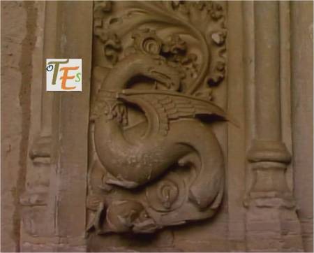 Figura simbólica en alquimia, representando al basilisco hermético. Animal híbrido alado, con cresta y cola de serpiente. Era temido en la edad media por su mirada. La corona ensartada al contrario en su cuello, significan los conceptos más oscuros y profundos de la psique humana. Se halla tallado en el bestiario hermético, el cual conforma el claustro de San Juan de los Reyes.