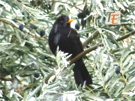 Curiosa postura de un mirlo toledano posado sobre un olivo, tratando de refugiarse de la nevada que le está cayendo encima. Este ahueca sus plumas repletas de grasa, para protegerse del intenso frío.