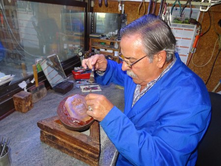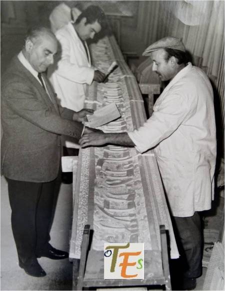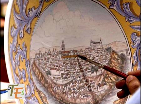 Sobre el diseño de un plato en cerámica, el pincel sujetado por las manos de un diestro alumno de la Escuela de Artes y Oficios, rellena con el óxido pertinente a los tejados de la primada de Toledo, para que al cocerle posteriormente, sus irisaciones le den un gran brillo y esplendor.