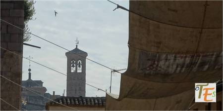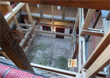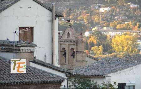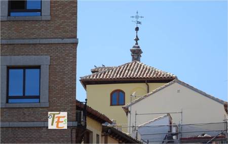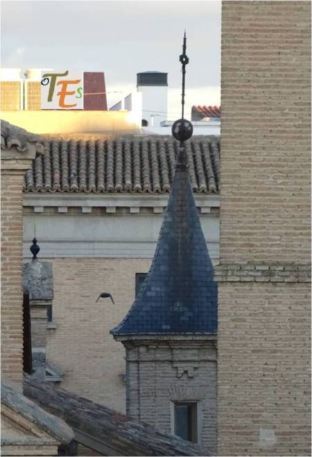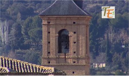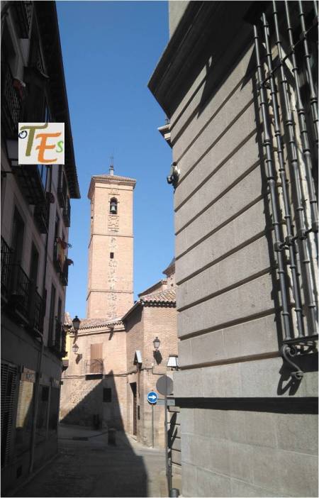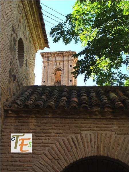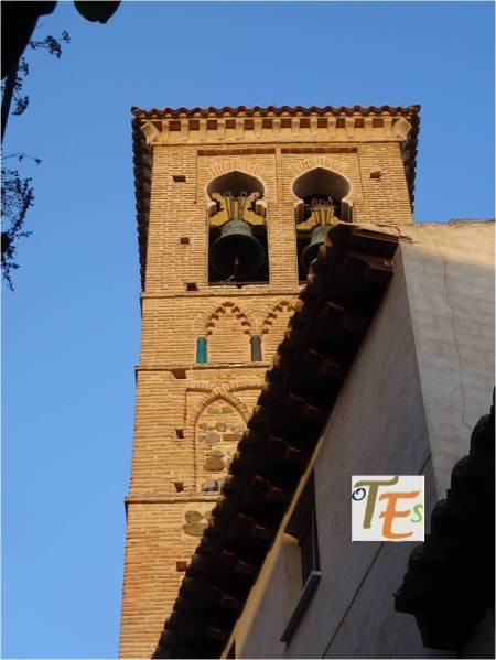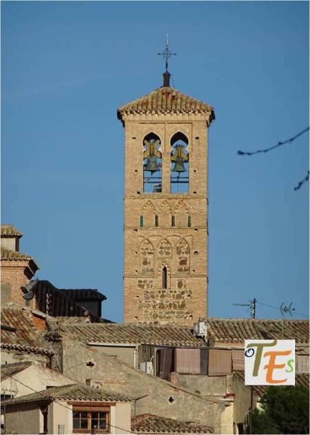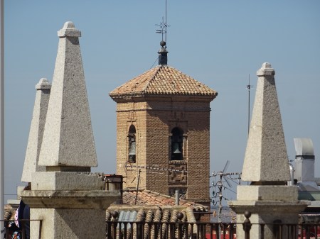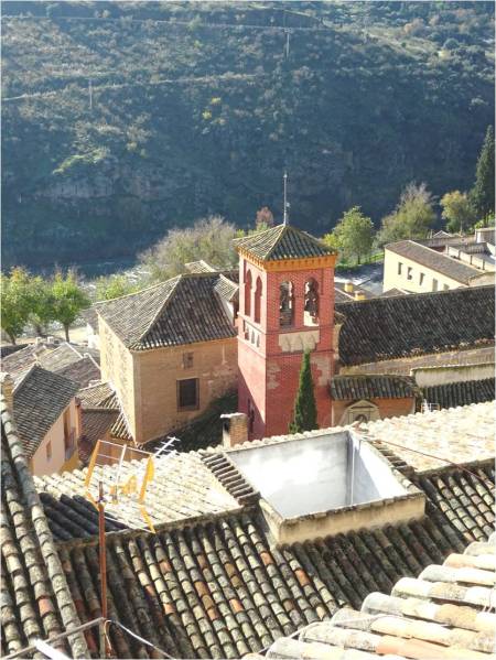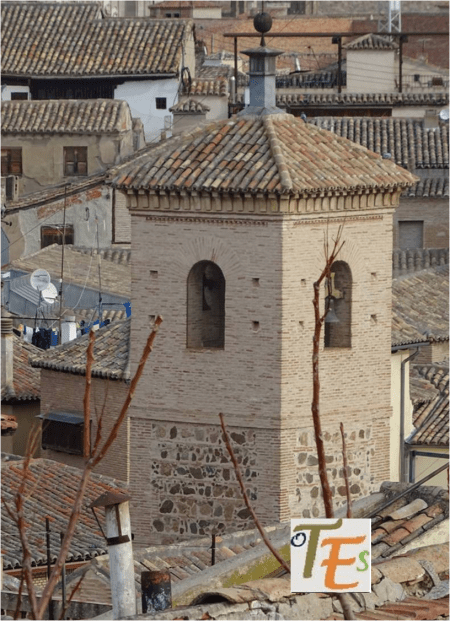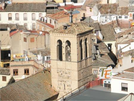 Desde las alturas, observamos la torre mudéjar de la antigua parroquia de la Magdalena, cuyo interior es usado para guardar algunos de los pasos que procesionan en la Semana Santa toledana.