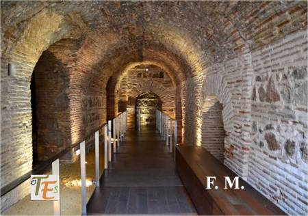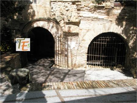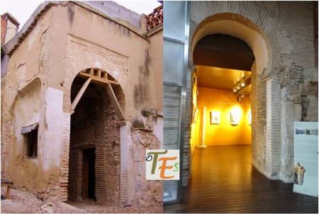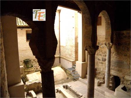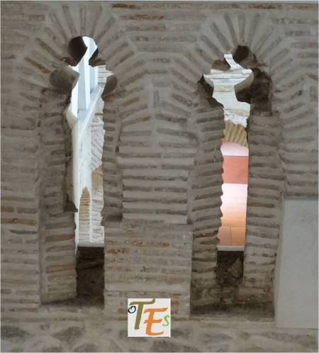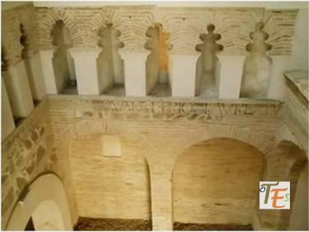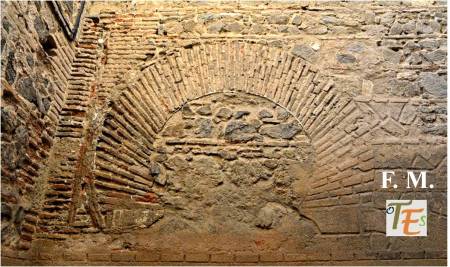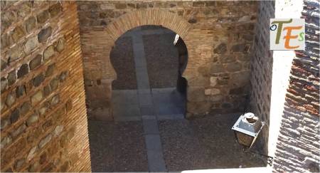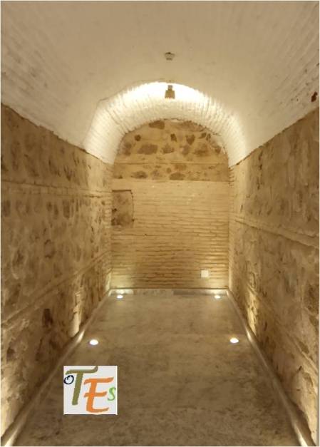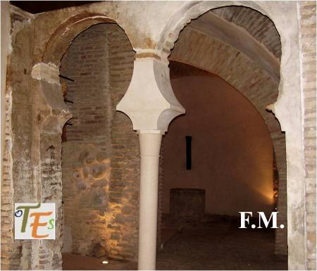 Doble arco de herradura, perteneciente a la entrada de un baño musulmán, cercano a la que fue mezquita Al-Yamí comunal de Tulaytula. Al fondo se encuentra el brocal hexagonal del aljibe que llenaba dicho balneum.