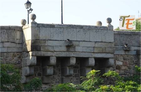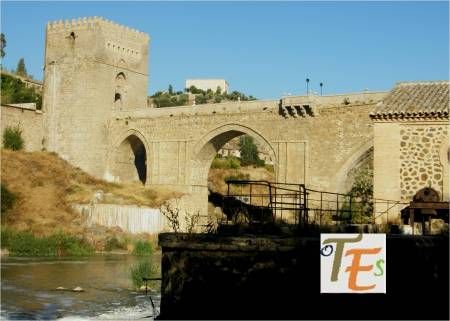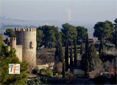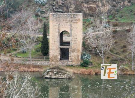 Vista aérea del torreón defensivo de salida, del Puente de San Martín. En ella podemos ver perfectamente, el quebrantamiento que tuvo sobre su cara sur, en la guerra civil entre hermanastros, como fueron el rey Pedro I «el cruel» y el que después de su asesinato, Enrique II de Trastámara, gobernó en Hispania. A un lado, se observa el espumarajo del contaminado río Tajo .