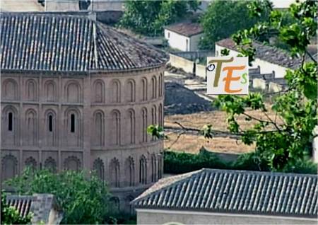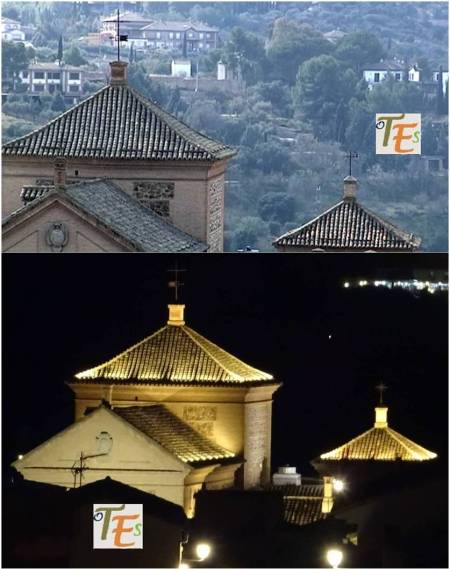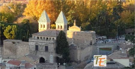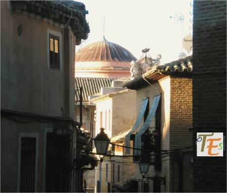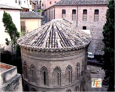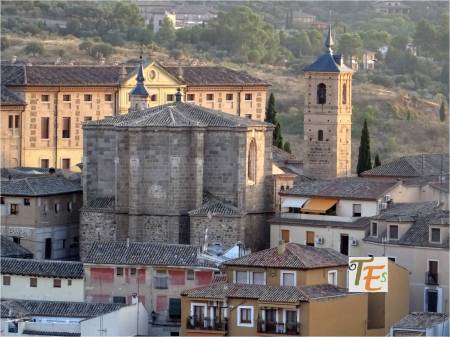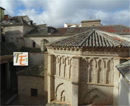 Con esta perspectiva, podemos ver uno de los edificios más longevos que contiene la ciudad de Toledo. Delante y en primer término, se encuentra la mezquita de Ibn Hadidi, hoy denominada como del Cristo de la Luz, siendo construida el año 999 de nuestra era. Adosada a la misma se encuentra una pequeña iglesia cristiana y su ábside, del mismo nombre y del siglo XII. Fue en esta última donde se cree que surgió por primera vez el mudéjar toledano, el cual dio su estilo a esta ciudad en la baja edad media.