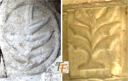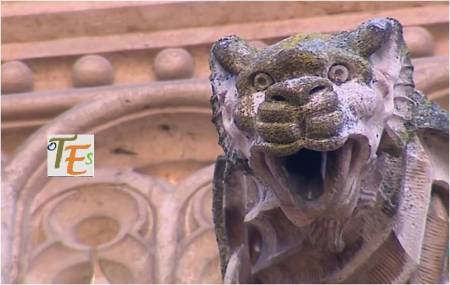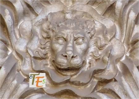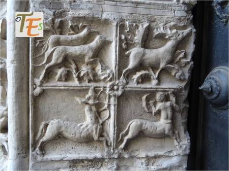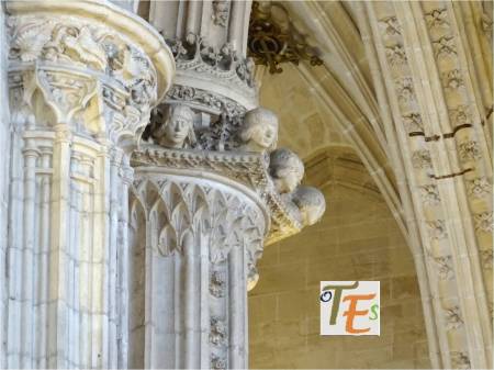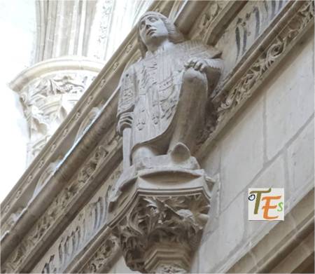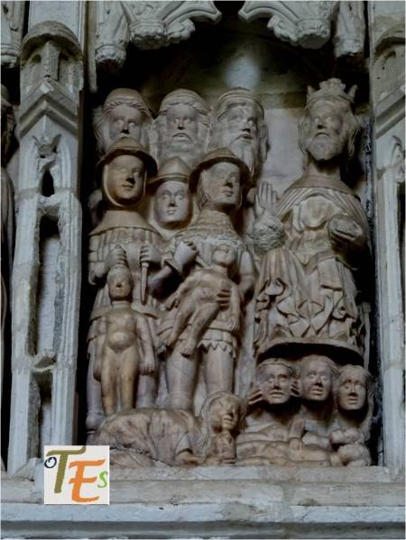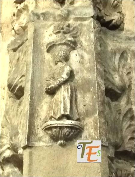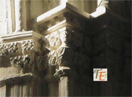Rostro vegetalizado en estilo gótico, con su policromía original dorada, el cual podemos ver embelleciendo el friso del dintel de una puerta catedralicia. Puede representar a una cabeza parlante o bafomet usado por los Templarios o quizás a su lado se elegía se elegía al rey de la procesión de los locos.