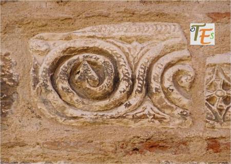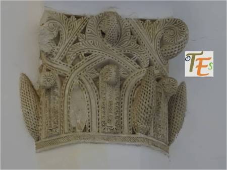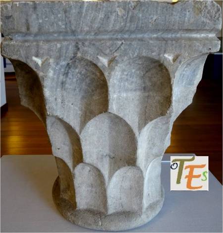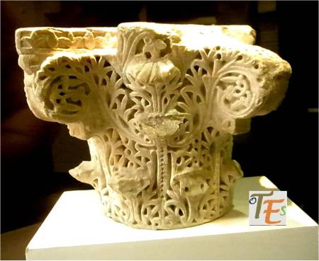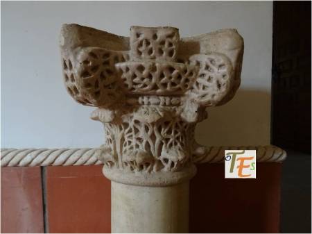 Precioso capitel islámico con volutas. Su talla por medio de la técnica de nido de abeja, contiene una sutilidad absoluta, pues determina ramificaciones vegetales, de donde salían sus frutos, hoy destruidos. Pertenece a los tesoros que se guardan y se exhiben, en los museos toledanos.