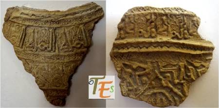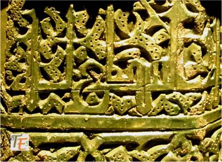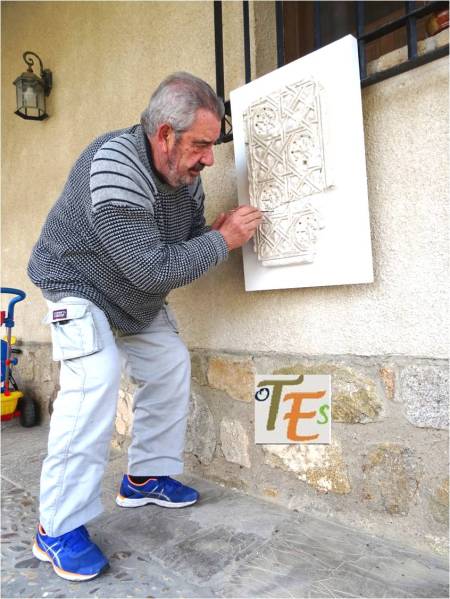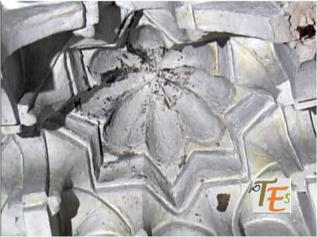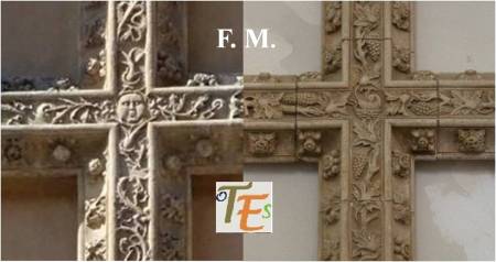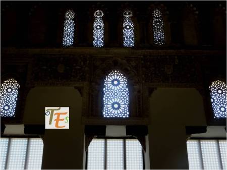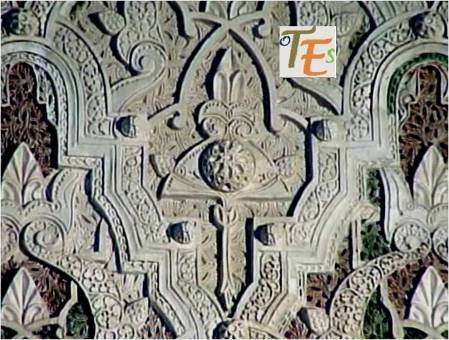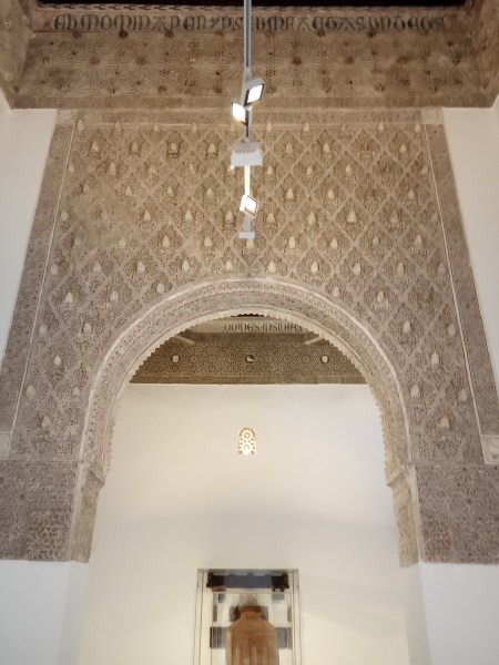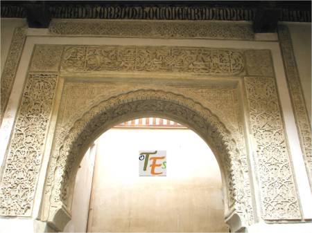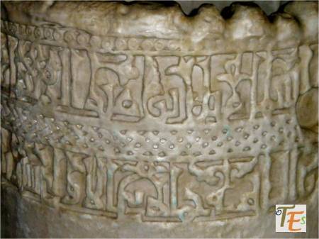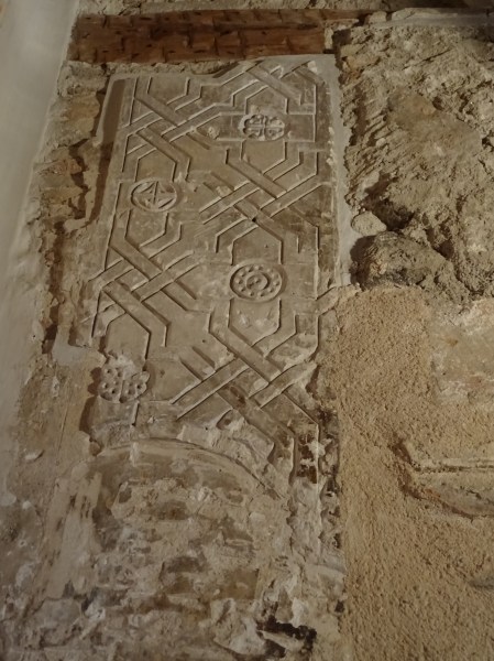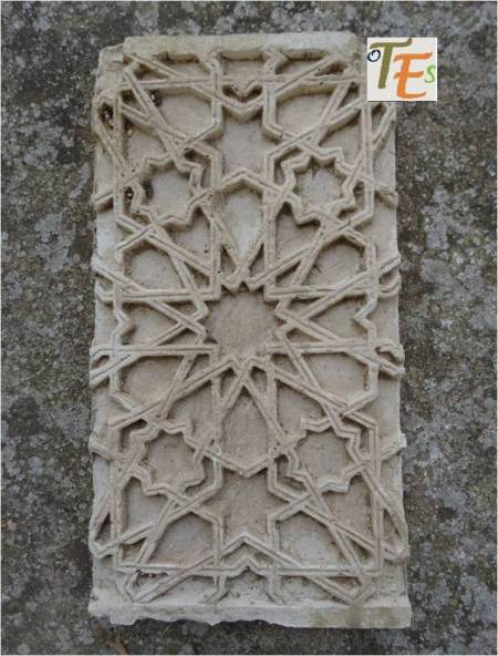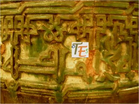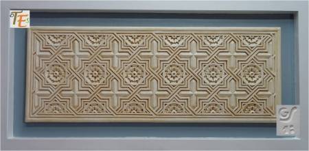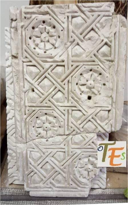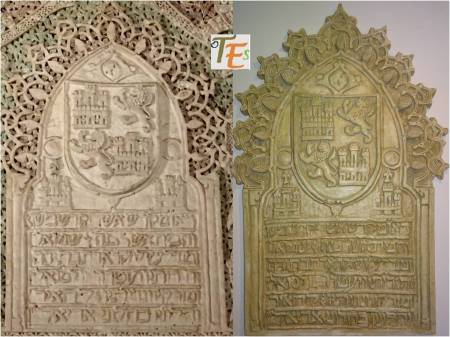 Otro de los vaciados que se hicieron sobre el riquísimo ataurique que contiene en su zona alta, la sinagoga de Samuel Ha-leví o del Tránsito. Se encuentra este enriqueciendo una de las paredes de la Escuela de Artes y Oficios. Entre otros detalles, observamos que además de la banda con los caracteres hebreos de los salmos, hay otras delicadas fajas rellenas de letras, del árabe nesjí, donde dice: “La felicidad y la misericordia”.