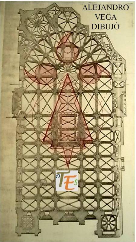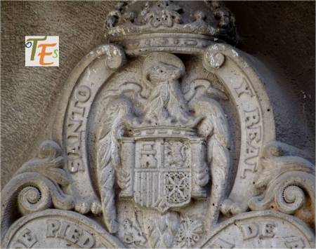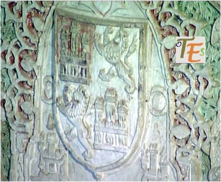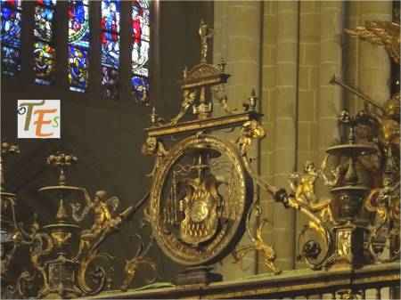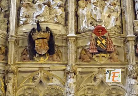 Acompañando a las figuras y filigranas talladas, para dar belleza al trasaltar de la catedral toledana, se adosaron dos escudos pertenecientes al reinado y al cardenalato de su tiempo. El águila de una sola cabeza coronando el escudo, perteneciente a los Reyes Católicos y el escudo del cardenal Mendoza, con el anagrama del «Ave María Plena».
