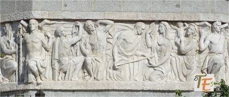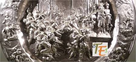 Detalle de la bandeja con la representación del «Rapto de las Sabinas», de Benbenuto Cellini. Cincelado por este orfebre en el siglo XIX. Corresponde a una obra magistral de una sola pieza, para el tesoro de la catedral de Toledo.