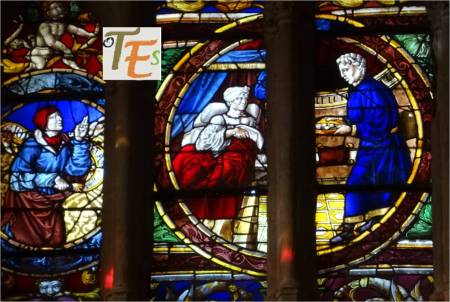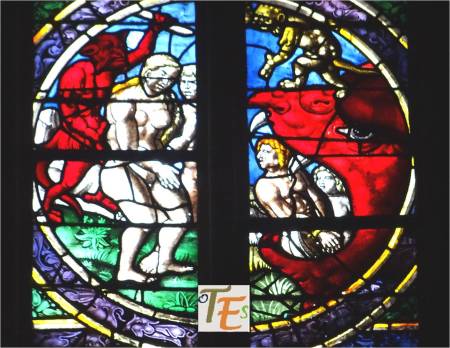 Vitral de la Anástasis, donde se observa a Adán y Eva, tras ser expulsados del paraíso terrenal, comprobando el futuro que les espera antes de entrar por la boca del Averno. Se halla en la catedral de Toledo.