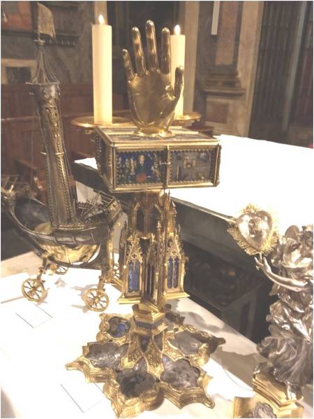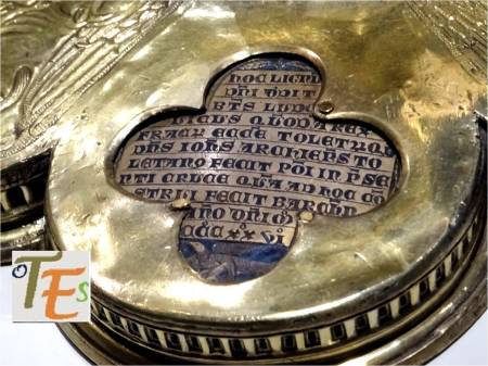 Aquí vemos el pie de una cruz del siglo XV que sustenta un relicario, el cual contiene un Lignum Crucis. Según la leyenda escrita en él, observamos que fue elaborado por el platero madrileño Juan González. Los materiales que uso para su confección fueron oro, plata dorada y ricos esmaltes.
