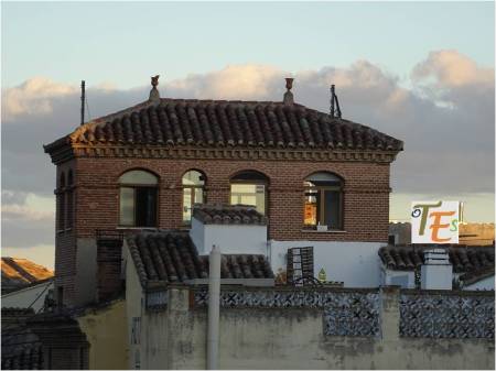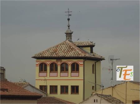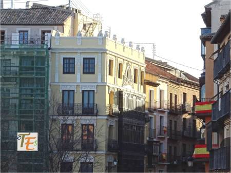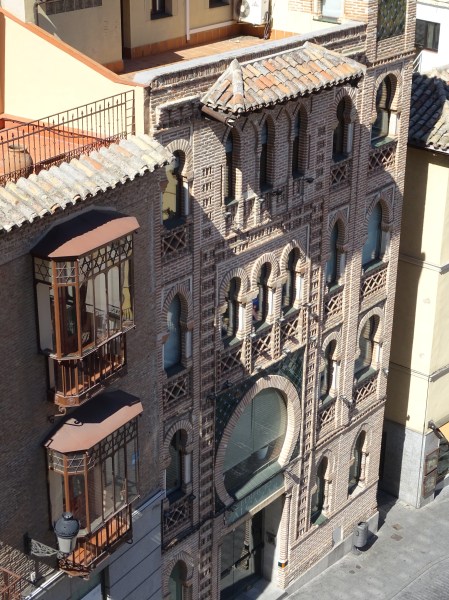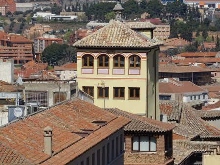 Desde las alturas, vemos frente a nosotros sobresaliendo el torreón neorenacentista y neomudéjar del antiguo Casino de Toledo, denominado como Centro de Artistas e Industriales. Dicha torre a la que se puede confundir con la de una de las iglesias de la ciudad se debe al arquitecto Felipe Trigo. Se encuentra achaflanada con respecto al edificio, tal como lo observamos en la instantánea.