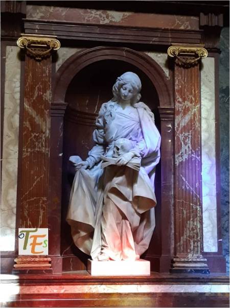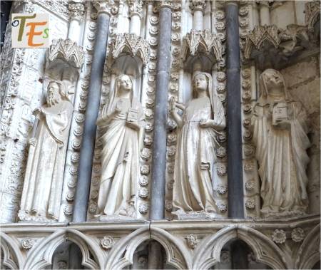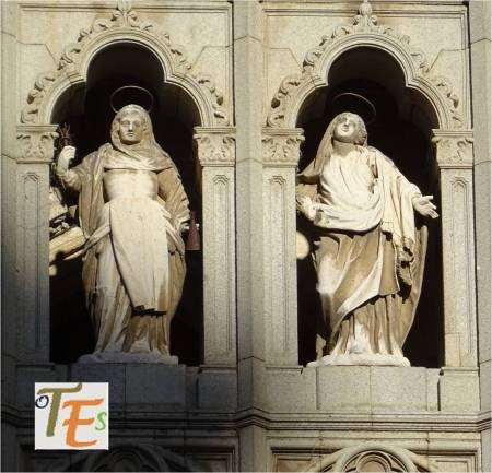 En el revestimiento del imafronte o fachada occidental de la catedral toledana, observamos en mármol y granito, a la virgen María el día de la pasión de su hijo y a María Magdalena con el recipiente para los ungüentos de enterramiento. Fueron talladas entre estilos neogótico y neoclásico el año 1787, por el arquitecto Eugenio López Durango.