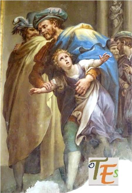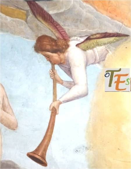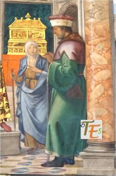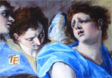 Escena celestial pintada al fresco por el gran artista Juan de Borgoña, sobre la zona derecha referida al Juicio Final, para la Sala Capitular de la catedral de Toledo. En ella vemos el rostro de la Virgen María y el de San Pedro, con sus halos de santidad y por encima de estos, un coro de niños cuyos diferentes rostros nos llevan a pensar “que la cara es el espejo del alma”. Quizás el artista se inspiró para ello, en el rostro de los seises, los cuales cantaban en el coro de esta catedral en su tiempo.