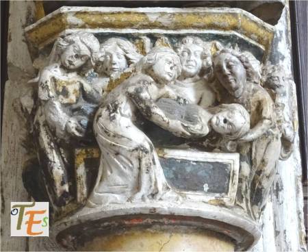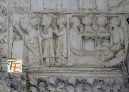 Capitel gótico en uno de los pórticos interiores de la catedral toledana, concretamente el de Santa Catalina de Alejandría, el cual da paso desde la nave hacia el Claustro. En el podemos observar, el entierro de la santa titular Catalina. Esta fue patrona de los filósofos, de ahí el significado de dicha puerta.