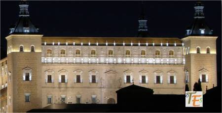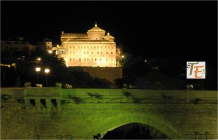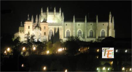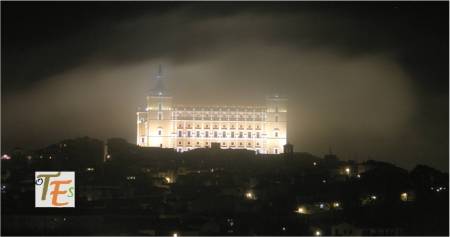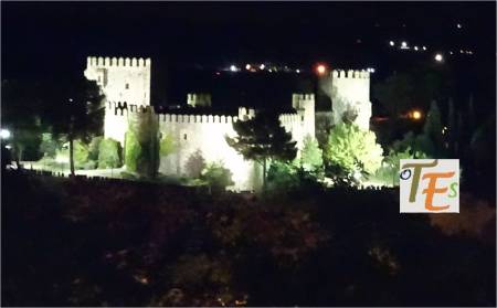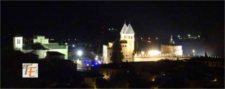 Aquí observamos la bella estampa nocturnal iluminada, de la parte alta de la Puerta de Bisagra, tomada desde el Miradero. Este monumento que recibe al visitante de la ciudad, se le debemos al maestro Alonso de Covarrubias, con sus cubos circulares exteriores renacentistas, con sus torres interiores mudéjares y sus tejados de cerámica vidriada.